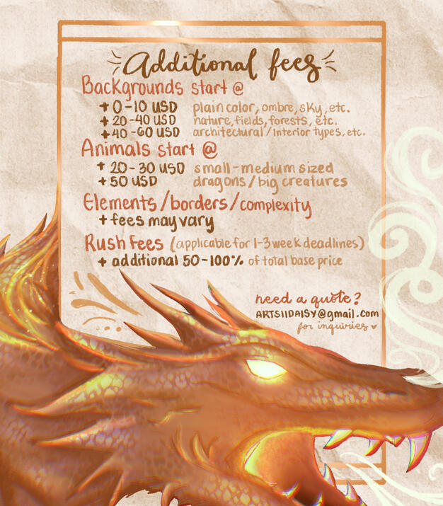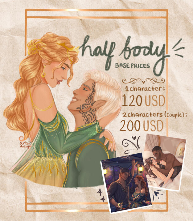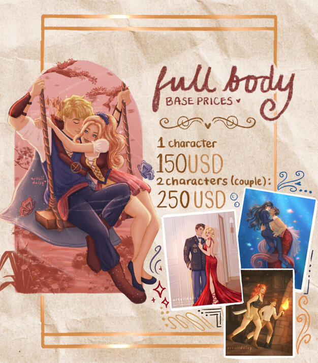 ✿ Late replies: Aside from the difference in our time zones, please also allow me a grace period of 1-5 days in replying. Med school takes up most of my time and there would be moments (like exam weeks) where I would be replying a lot slower. If there would be any delays with the deadline, I'll be sure to communicate this with you beforehand. Feel free to follow up or bump me as well if I go over a week in replying. You can also dm me over on instagram @artsiidaisy.✿ Rush fees: My normal turnaround time would be 4-7 weeks upon receiving the first half of the payment. Anything under or equal to 3 weeks would be considered as a rush commission and would be subjected to an additional fee of +50% to +100% of the total.✿ I usually book out at least 1-2 months in advance. It would be ideal to reach out at least 2 months before your actual deadline to ensure your slot.By proceeding to commission me,